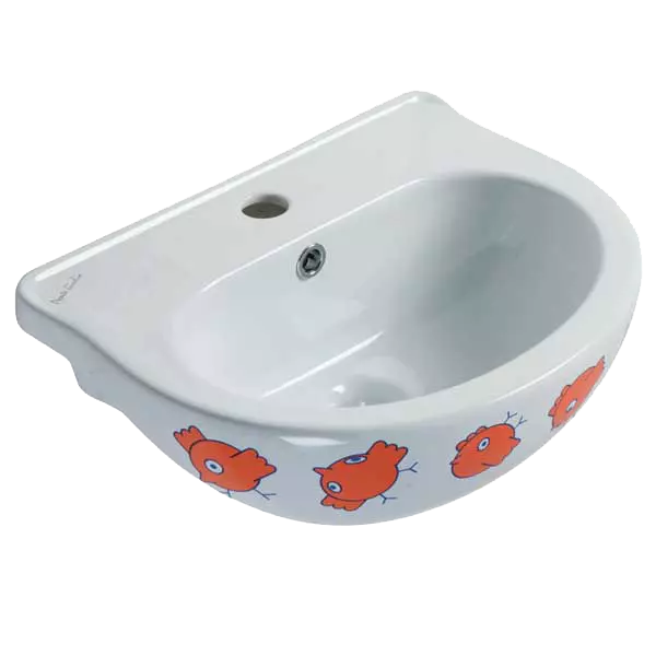 Lavatório infantil suspenso B44CMD02 em porcelana vitrificada branca, com decalque esmaltado a fogo da série BIRDO.