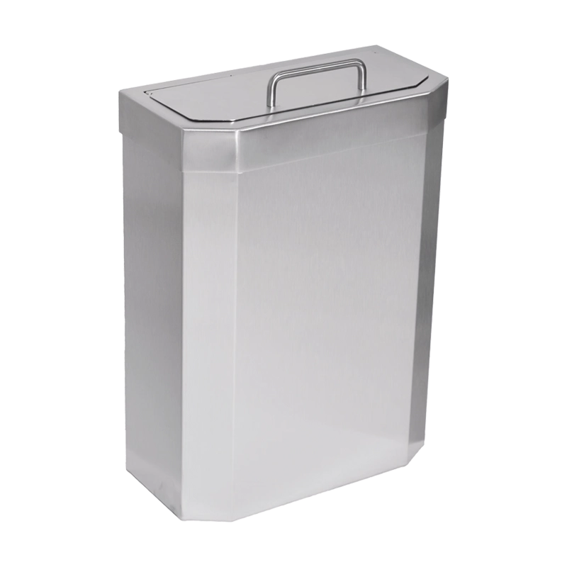 Contentor de higiene feminina PPA4010CS de acabamento escovado, e acionamento manual, com capacidade 10 L, indicado para instalações sanitárias de frequência de utilização muito alta e colectividades, concebido para eliminação discreta de artigos de higiene, impedindo a visualização do conteúdo através de um sistema de dupla tampa integrado no cabeçal ao levantar a asa. da marca Mediclinics.