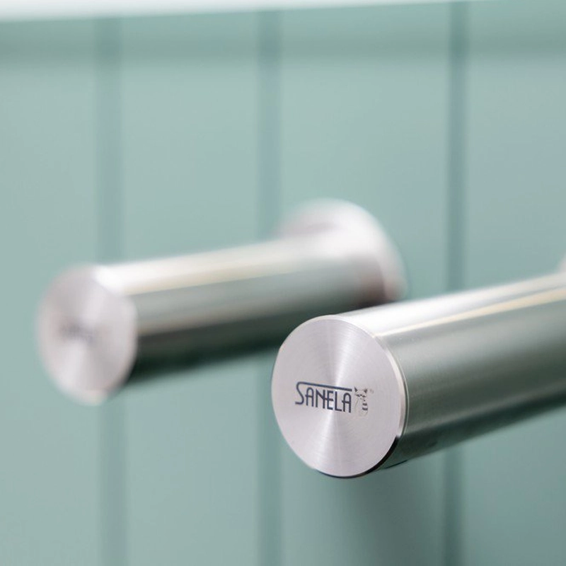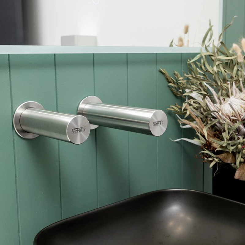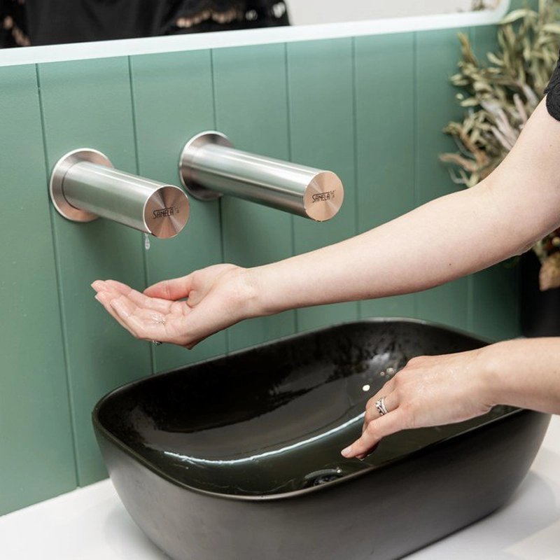 Dispensador de sabão SLZN 83E automático, de parede, da marca Sanela. Construída em aço inoxidável com reservatório de sabão de 1L, 230 V AC.