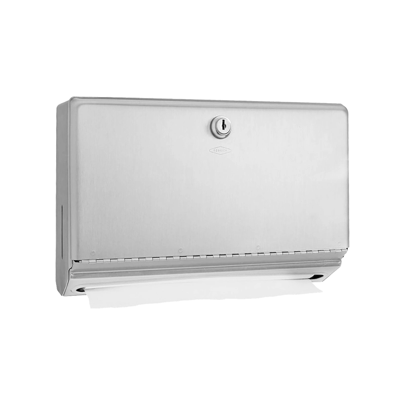 Dispensador de toalhas de papel B-26212 para montagem à parede (sobrepor), fabricado em aço inoxidável tipo 304 (18-8) com acabamento escovado, de construção totalmente soldada.