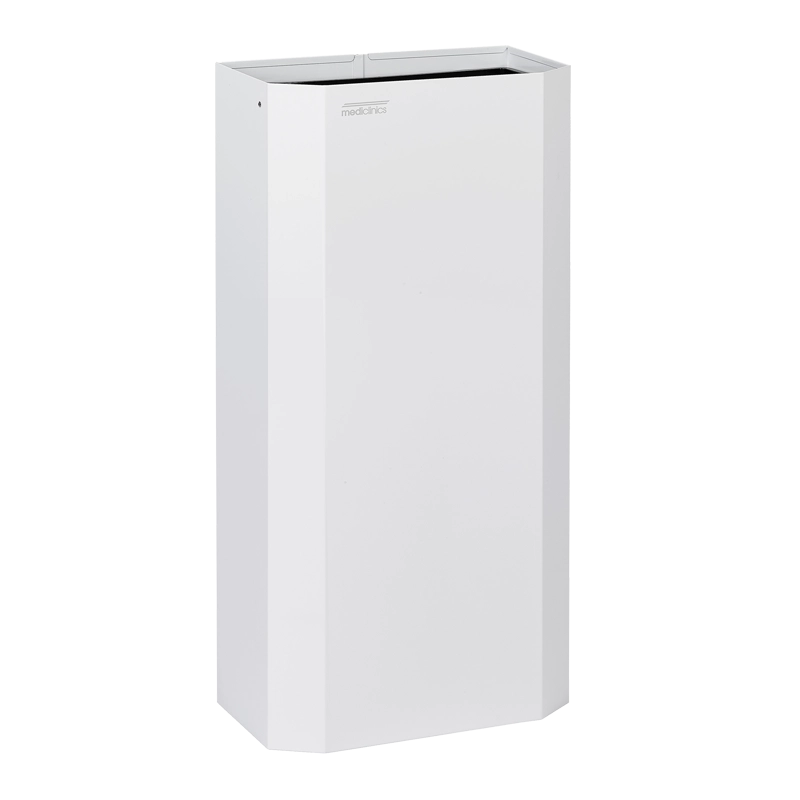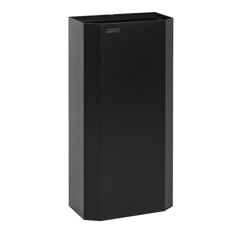 Papeleira de parede PPA4279C, aberta retangular, para utilização em instalações sanitárias e áreas públicas interiores de tráfego médio, modelo apto para instalações sanitárias publicas, com aro basculante em polipropileno (PP) preto para fixação do saco do lixo.