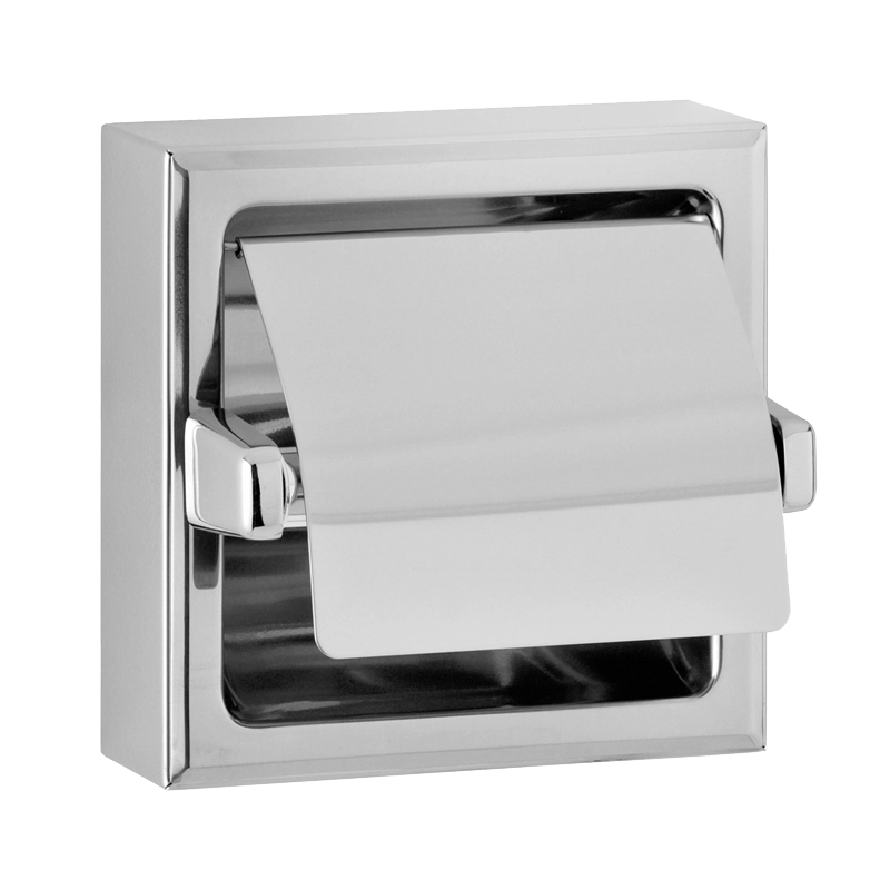 Porta rolos B-6699 é em aço inoxidável, AISI 304. A caixa e o rebordo são uma peça de construção semelhante da marca Bobrick.