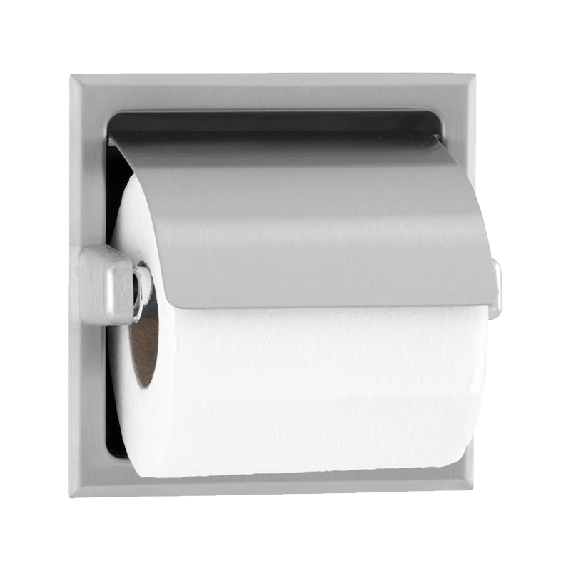 Porta rolos encastrável B-6697 com tampa, construído em aço inox AISI 304 com acabamento escovado da marca Bobrick.