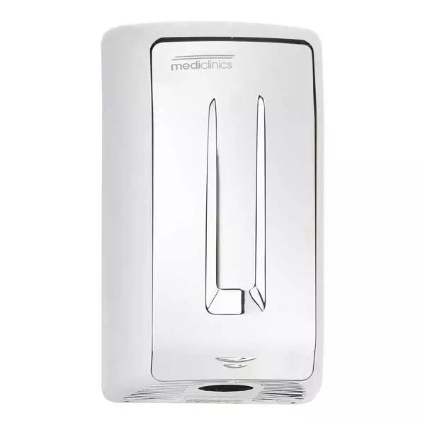 Secador de mãos automático M04AC SMARTFLOW® da Mediclinics de ar quente. Com accionamento automático por infra-vermelhos através da detecção de aproximação das mãos, com distância regulável entre 15-25 cm. Adequado para casas de banho que requerem acessórios de pequenas dimensões e que têm uma frequência de utilização baixa/média. Máquina compacta com durabilidade máxima na sua categoria.