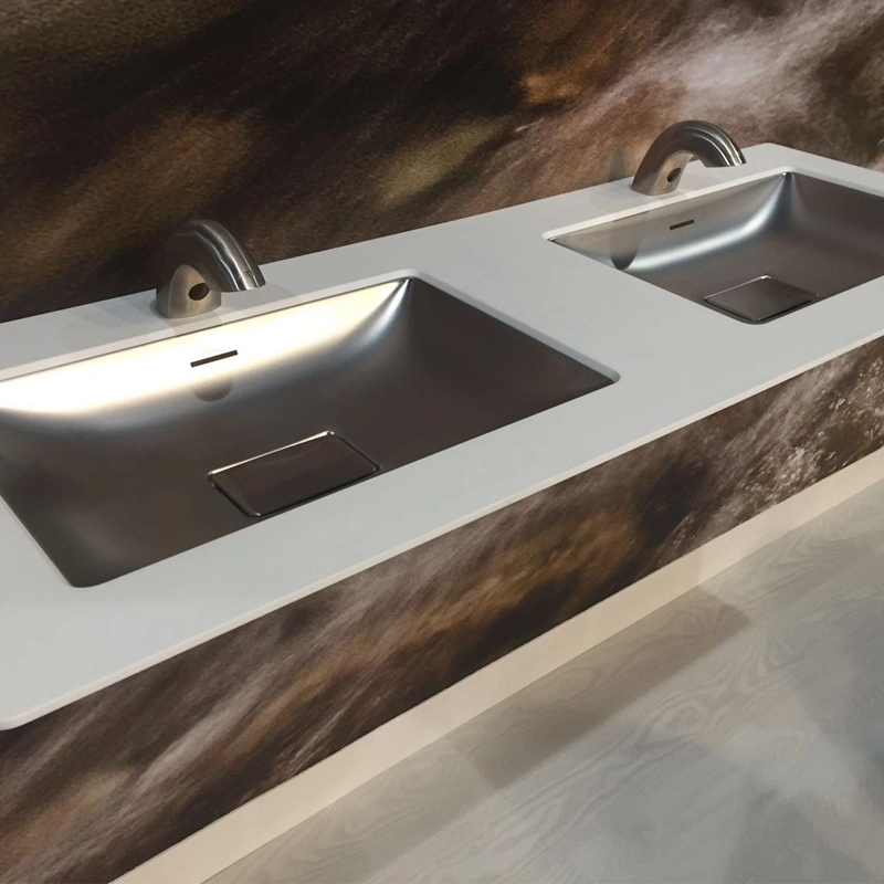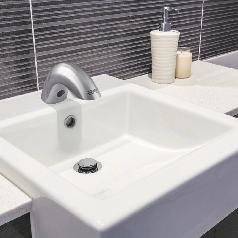 Torneira de lavatório SLU46 automática em aço inoxidável, para água fria e quente, 24 V DC, da marca Sanela. A água continua a fluir enquanto as mãos estiverem no alcance do sensor e deixa de fluir após a remoção das mãos dessa área. Tem função de paragem automática da água após 5 minutos de fluxo contínuo.
